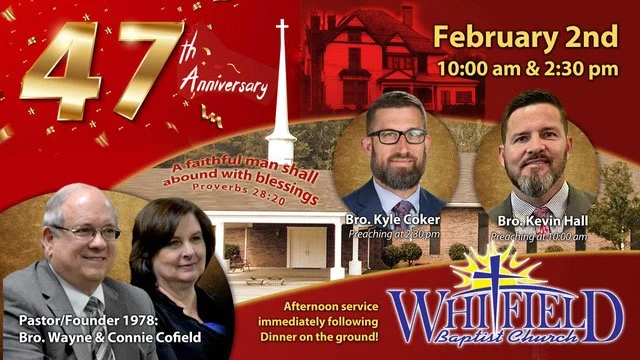 Pastor and the members of Whitfield Baptist Church would like to cordially invite you to attend our anniversary celebration on Sunday, February 2nd. .